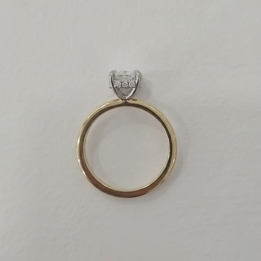 The Greta Solitaire engagement ring is a beautiful blend of classic elegance and modern sophistication. At its heart lies a captivating elongated cushion-cut diamond, renowned for its soft, rounded corners and brilliant facets that exude a timeless allure. This centre diamond, with its vintage charm and modern sparkle, is the perfect choice for a bride. Crafted with an 18k yellow gold band and an 18k white gold setting, the perfect blend of white and yellow gold.