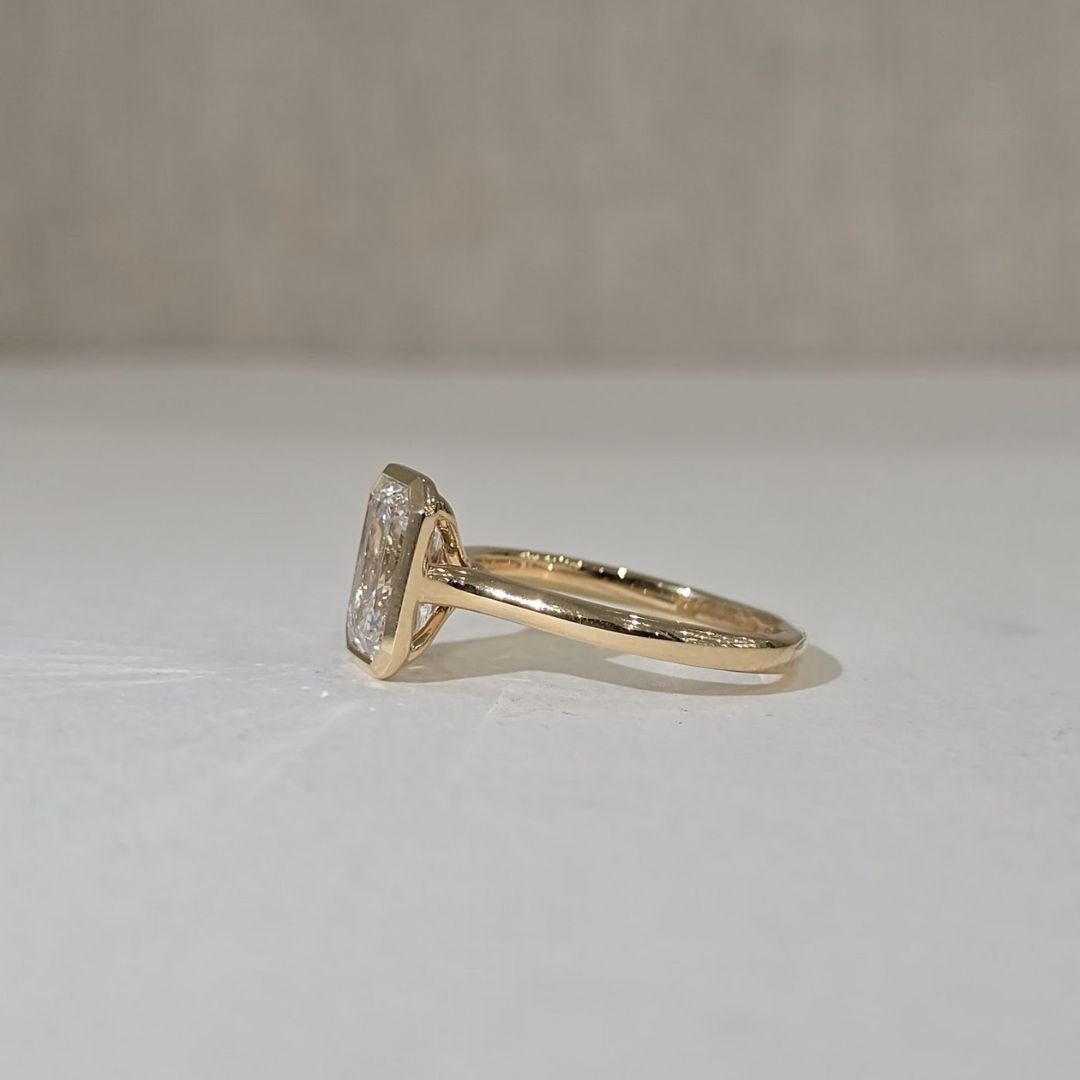 Showcasing a striking 2.03ct emerald diamond elegantly set in a sleek bezel, the Jimena Cathedral Bezel combines timeless beauty with modern design. This exceptional piece offers both durability and refined charm.