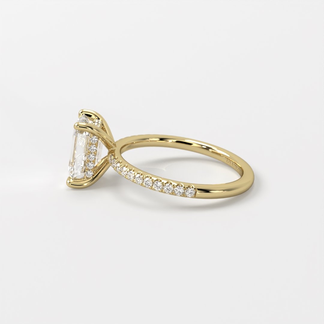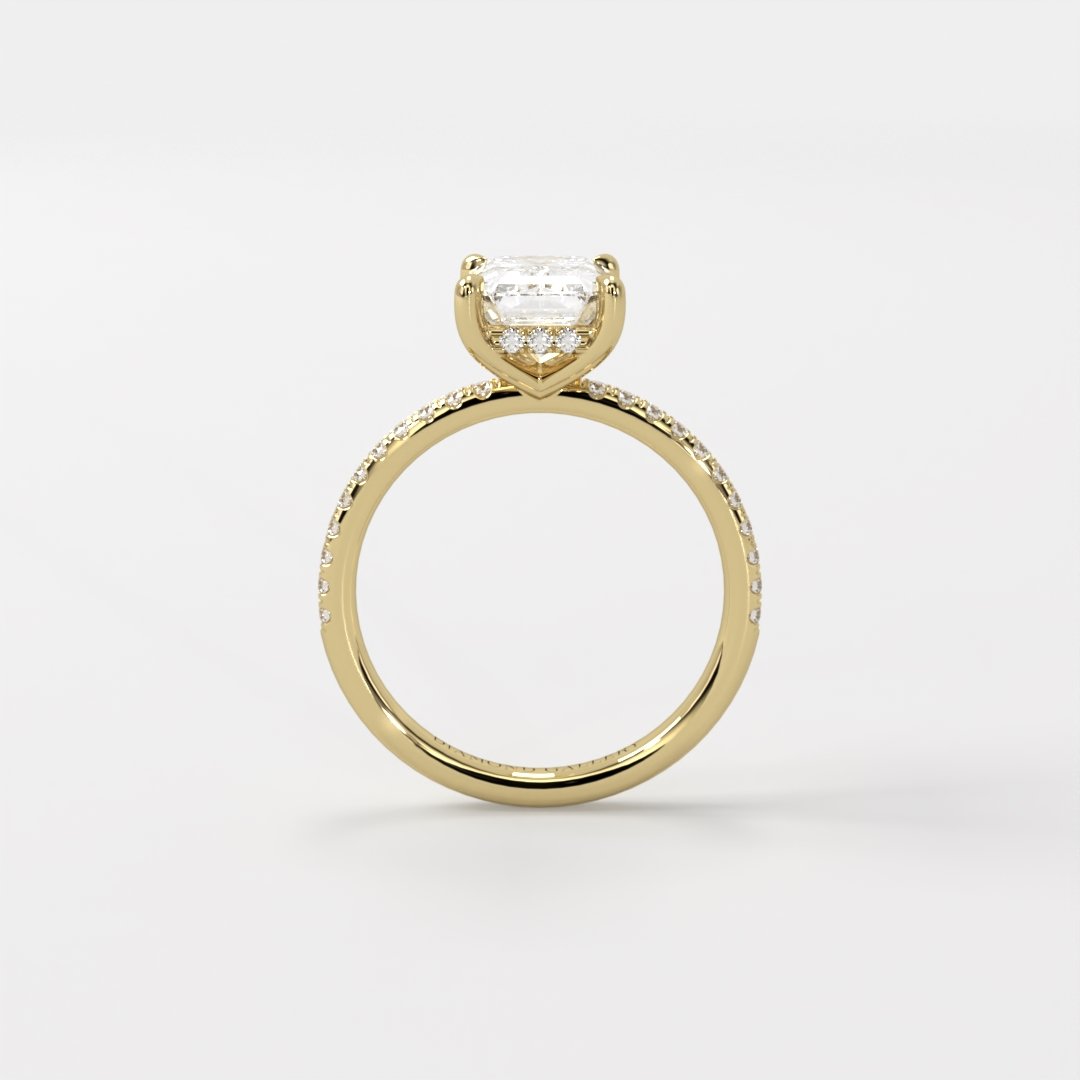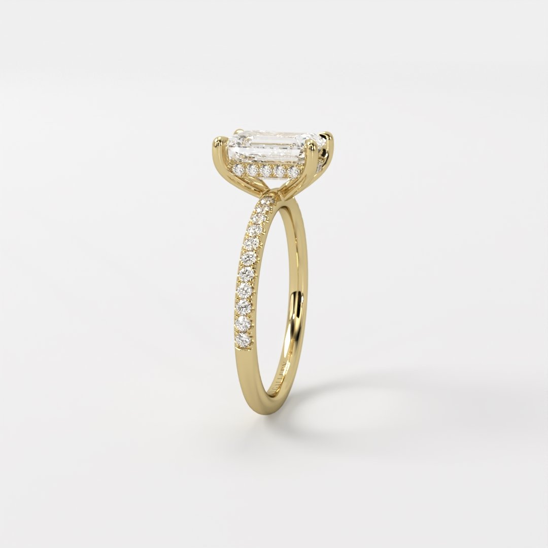 The Juliette: A captivating solitaire engagement ring featuring an Emerald diamond, with a hidden halo of diamonds and delicate pave accents, designed to enhance the brilliance and elegance of the centre stone.