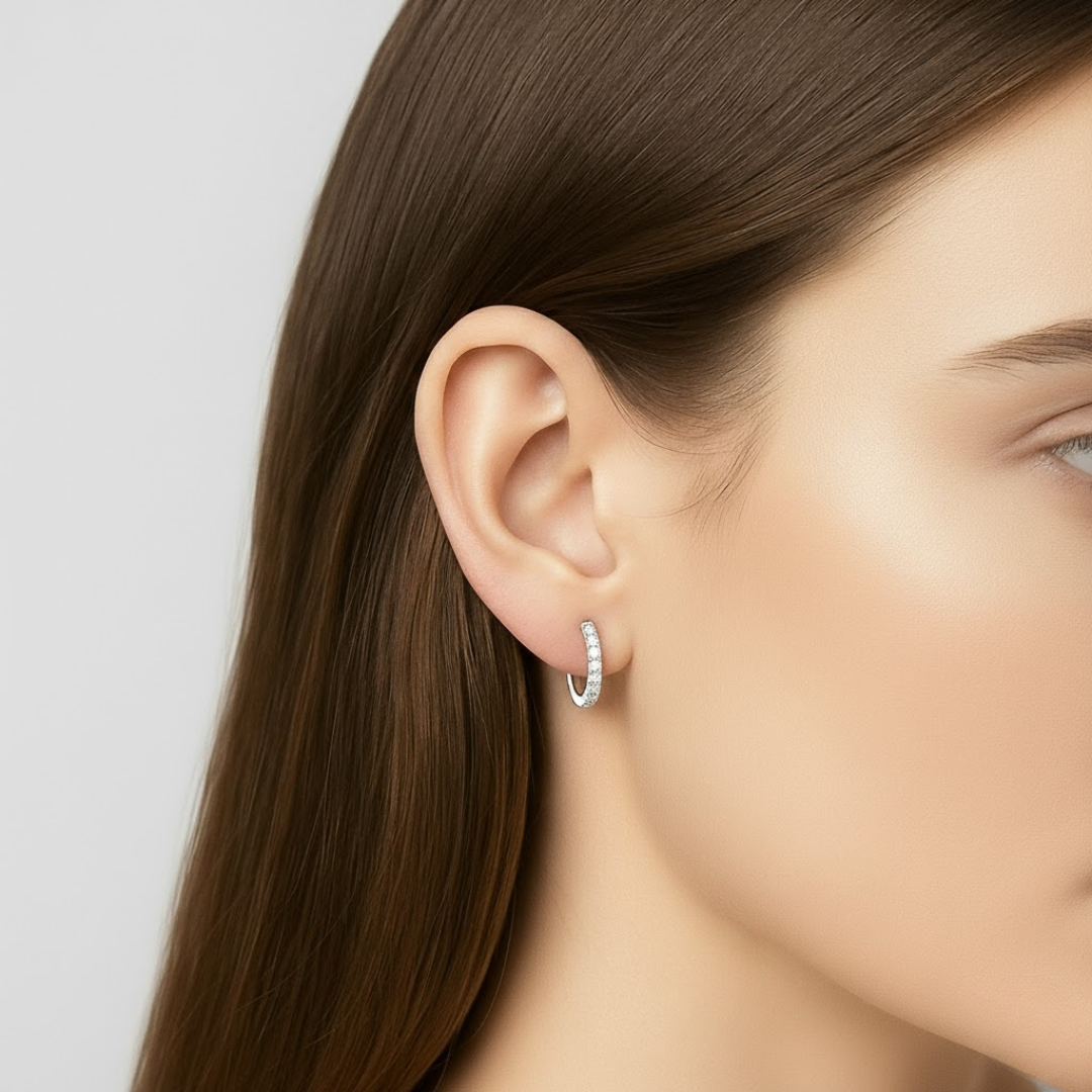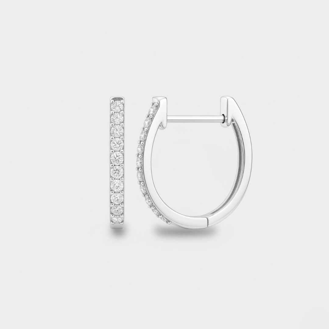 Gracefully subtle, our Layla round huggies trace the lobe with a refined band of light. Crafted in luminous 9ct white gold, each hoop is grain-set with 0.15ct of natural diamonds for a soft, continuous shimmer. A slim, comfortable profile and secure hinged closure make them an elegant everyday signature, beautiful worn solo or layered.