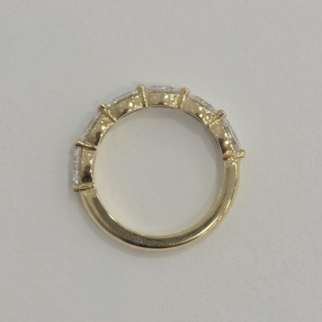 The Lucille offers a refined twist on the traditional diamond band, showcasing a row of oval-cut diamonds set in a sleek east-west orientation. Each stone is carefully positioned to maximise light and create a continuous flow of brilliance.