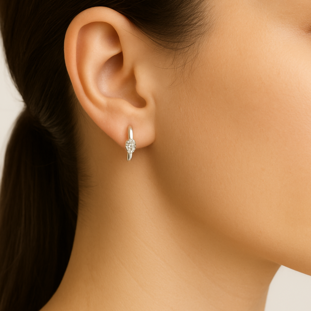 Sculpted in polished 9ct white gold Our Marina oval diamond huggie earrings rests in a refined embrace. The contour sits close to the lobe for effortless wear, closing with a quiet, secure click.