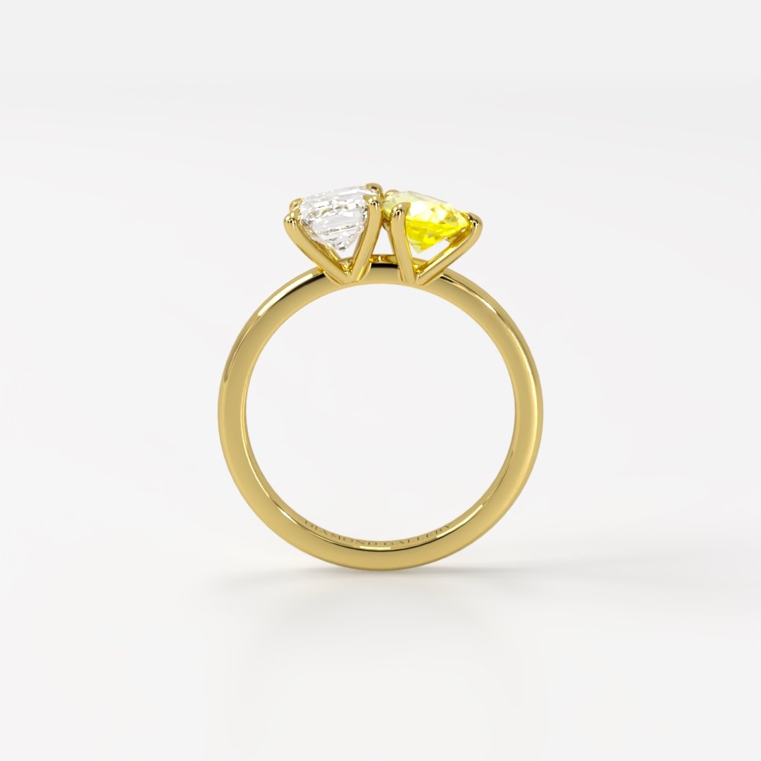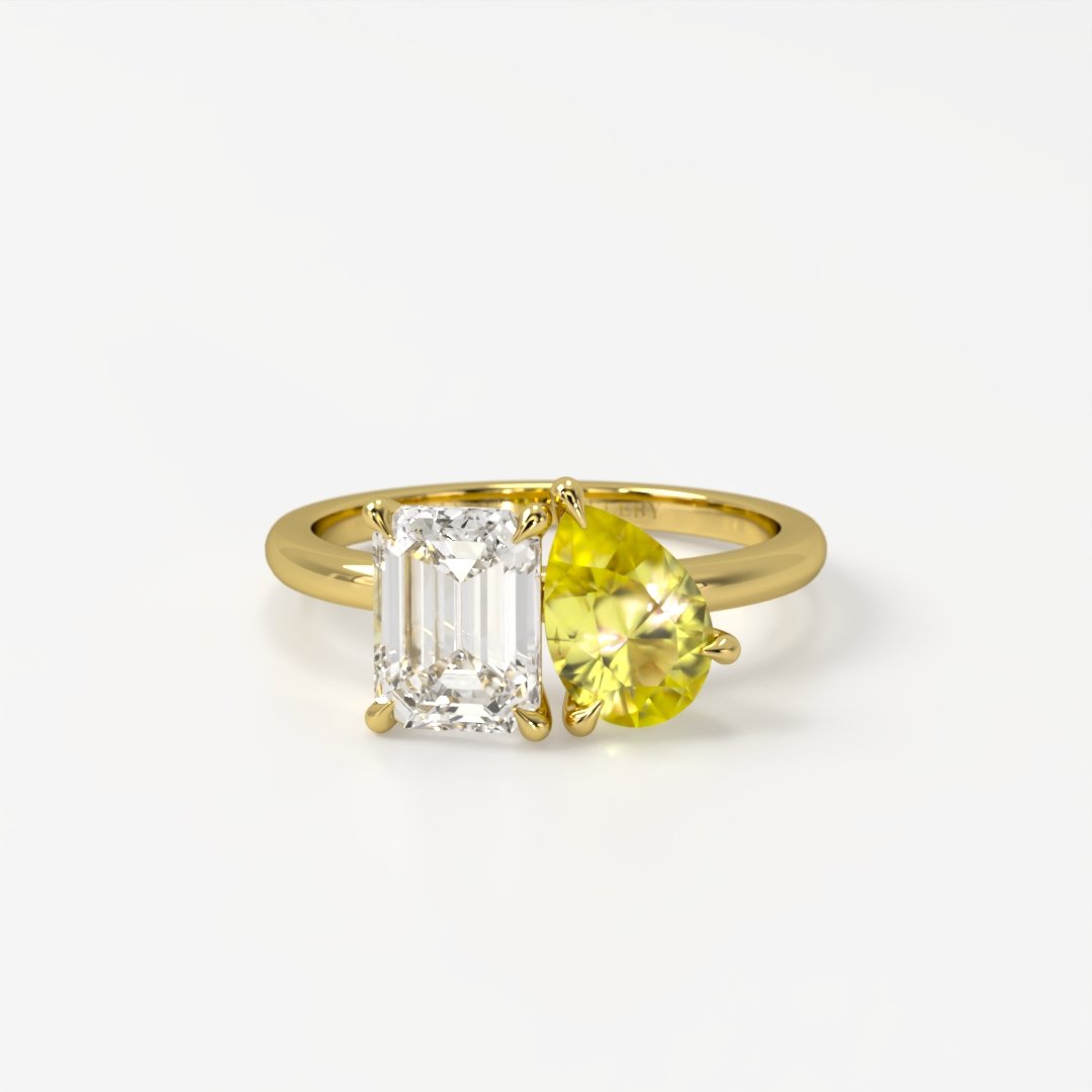 The Paloma Toi et Moi ring features a stunning 1.5ct emerald lab diamond paired with a brilliant 1.5ct pear shaped yellow lab sapphire. The rich yellow hue of the sapphire contrasts beautifully with the diamond’s radiant sparkle, creating a perfect balance of elegance and brilliance. Set in a sleek design, this ring is a unique and sophisticated symbol of love and commitment.