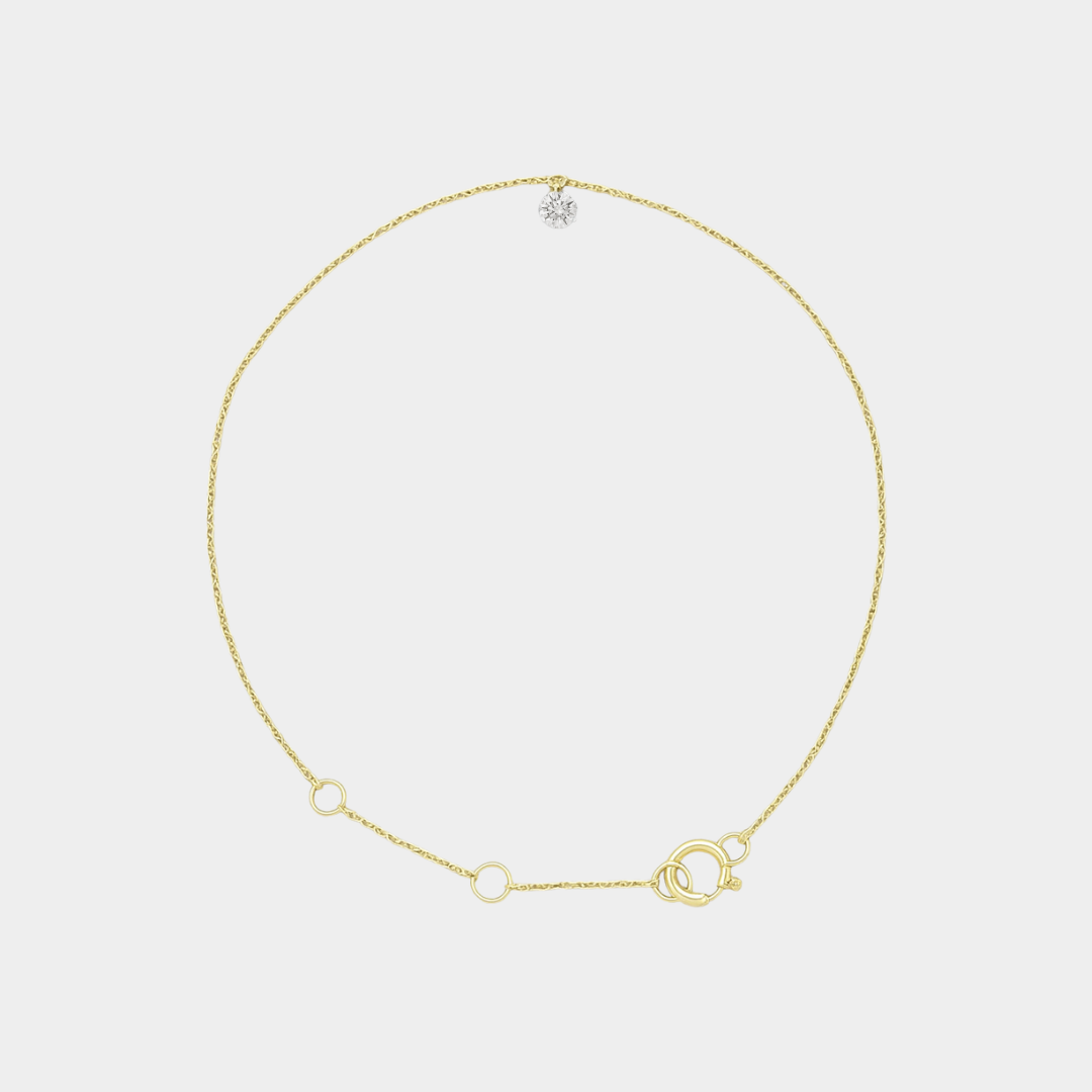 A fine trace chain in 14ct yellow gold rests lightly against the wrist, from which a single 0.15ct natural round diamond delicately suspended. The round brilliant diamond moves with you and catches the light with a soft, refined sparkle — never loud, always luminous. Graceful and understated, Poppy sits like a whisper on the skin. Worn alone, it feels intimate and personal. Layered, it adds a note of pure femininity to any stack. This is the piece you never take off.
