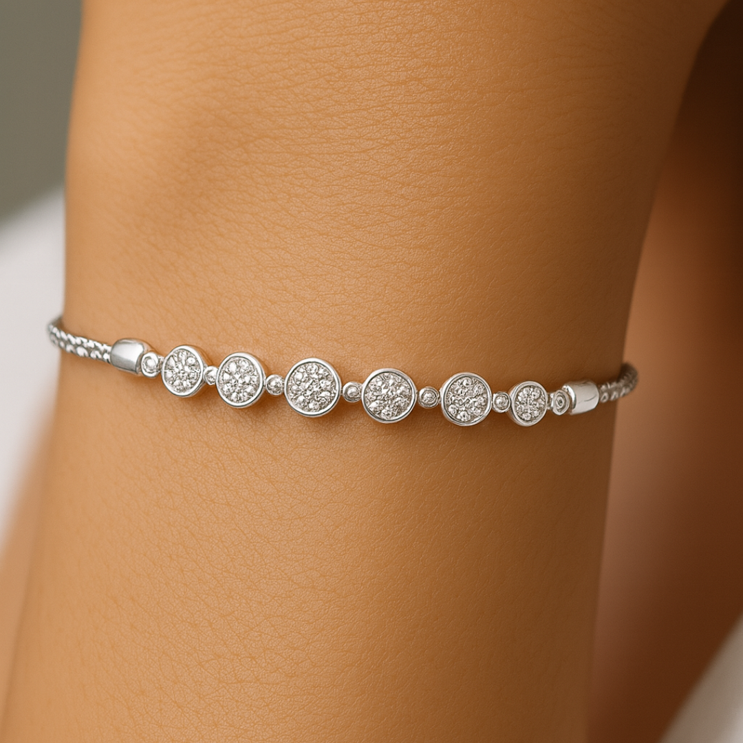 The Reagan Diamond Bracelet offers brilliant sparkle in a chic, contemporary design. Perfect for gifting, this piece features a graceful line of seven diamond clusters, each crafted to catch the light from every angle. The bracelet is crafted from shimmering 9ct white gold and set with a total of 0.50ct of natural diamonds. Its innovative bolo closure design—a smooth, sliding mechanism—allows you to effortlessly adjust the size for a perfect, secure, and comfortable fit on any wrist.