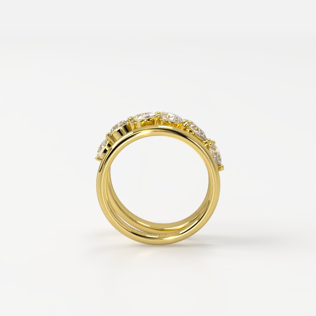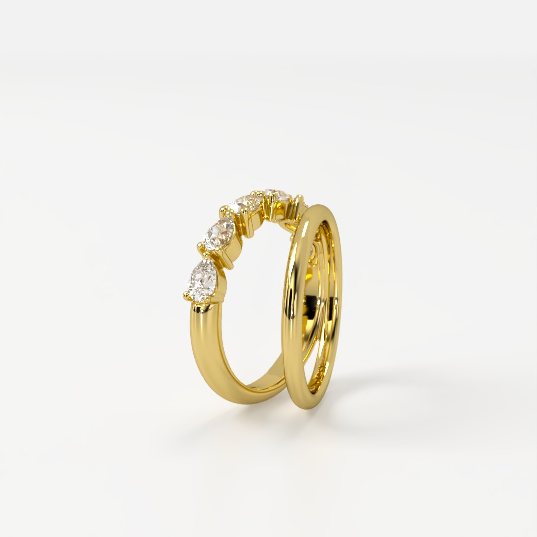 A modern interpretation of elegance, the Scarlett ring pairs two distinct bands in perfect harmony—one refined and polished, the other set with six luminous pear-shaped diamonds. The asymmetrical design creates a sense of movement and balance, with each diamond delicately angled to catch the light with every gesture.
