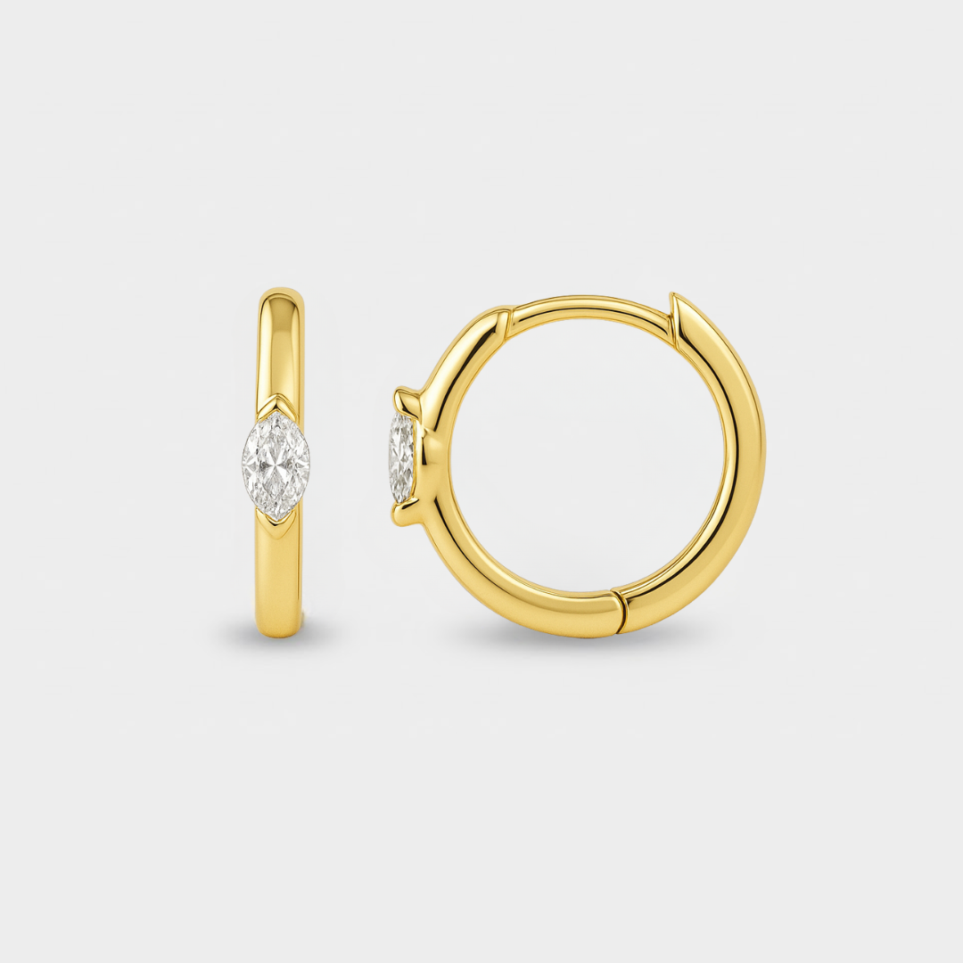 Gracefully refined, our Sonia huggies curve in a clean ribbon of 9ct yellow gold, framing an east-west marquise lab diamond for a delicate flash of light. Smooth, low-profile comfort and a secure hinged click make them effortless every day.